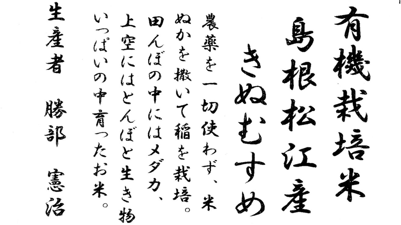 山の湧き水が注がれる刈取り後の冬の田んぼの水を抜かず、また耕すこともせずに、水中のイトミミズや微生物の力で土作りをする冬期湛水(とうきたんすい)という農法で育てています。その為、田んぼの中には沢山のめだかやタニシ、稲株には蜘蛛、上空にはとんぼが飛び回るような自然と一体化した稲作。さっぱりとした中に自然な甘みを感じられ、様々なおかずに合わせやすく、幅広い客層の方に好評です。