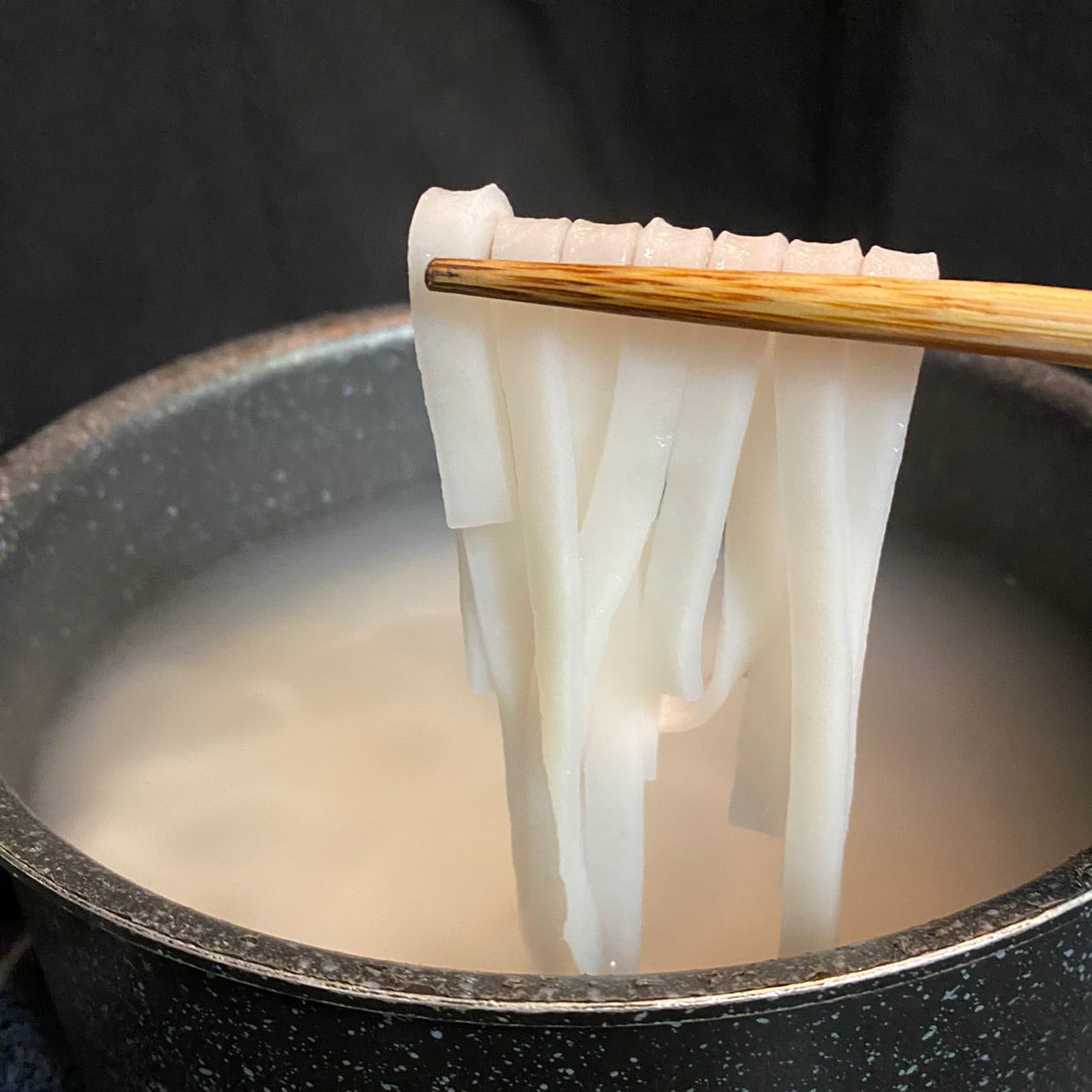 「つや姫うどん」の細さは茹でる前の状態で約6ミリです